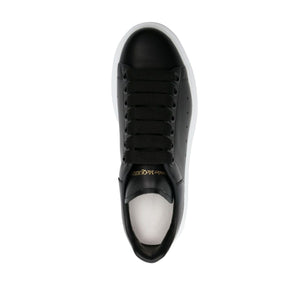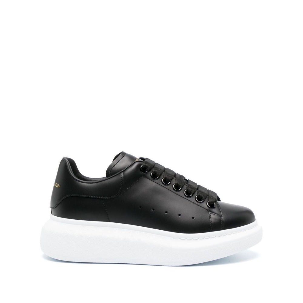 Black leather Oversized low-top sneakers from Alexander McQueen featuring branded heel counter, logo-print tongue, round toe, front lace-up fastening and flat rubber sole. To lessen the environmental impact and to reduce cotton consumption, Alexander McQueen will no longer be providing a dust bag with its sneakers.. Oversize sneakers Size and Fit - Heel 1,8 in / 4,5 cm; Platform 1,3 in / 3,2 cm