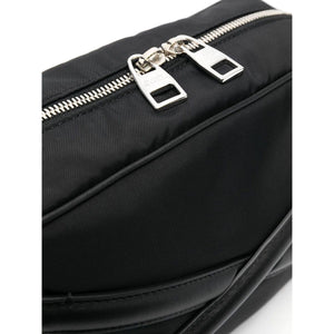 The Harness camera bag from Alexander McQueen featuring black, leather trim, logo print to the front, silver-tone hardware, two-way zip fastening, adjustable detachable shoulder strap, slip pocket to the rear, internal slip pocket and full lining. Harness nylon camera bag Size and Fit - Width 8,66 in / 22 cm