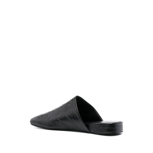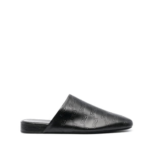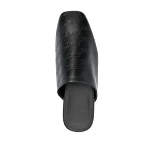 debossed-logo leather mules from BALENCIAGA featuring black, calf leather, all-over debossed logo print, slip-on style, round toe and flat leather sole. Cosy BB leather slippers Size and Fit - Heel 0,8 in / 2 cm