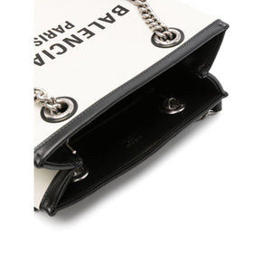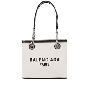 small Duty Free tote bag from BALENCIAGA featuring light beige, black, canvas, logo print to the front, leather trim, two leather and chain-link top handles, open top and main compartment. We've partnered with Good On You — an independent agency that rates how brands perform in relation to their impact on the planet, people and animals, with a multi-criteria rating simplified to a five points scale. In order to be awarded our conscious label, larger brands need to score a minimum of four out of five ('Good'), while smaller brands must score at least three out of five ('It's a start'). This item comes from a brand rated four out of five ('Good') by Good on You. Please note, this is a brand-level rating and does not guarantee that this product is made with conscious materials.. Learn more about what makes a product Conscious on our Conscious Criteria page. Duty Free small canvas tote bag Size and Fit - Width 9,06 in / 23 cm