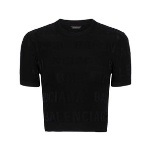 black lightweight construction all-over logo embroidery round neck short sleeves ribbed cuffs and hem cropped We've partnered with Good On You — an independent agency that rates how brands perform in relation to their impact on the planet, people and animals, with a multi-criteria rating simplified to a five points scale. In order to be awarded our conscious label, larger brands need to score a minimum of four out of five ('Good'), while smaller brands must score at least three out of five ('It's a start'). This item comes from a brand rated four out of five ('Good') by Good on You at the time it was added on FARFETCH. Please note, this is a brand-level rating and does not guarantee that this product is made with conscious materials. Allover logo top Size and Fit - This piece fits true to size. We recommend you get your regular size. Model is 1,75m / 5ft 8in wearing size S