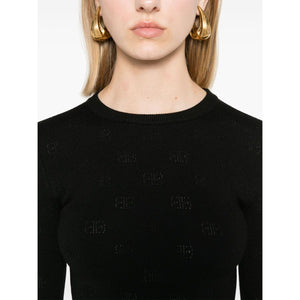 black wool blend open knit BB pattern crew neck long sleeves straight hem cropped unlined Open-knit wool top