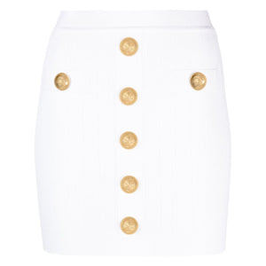 ribbed-knit mini skirt from Balmain featuring ribbed knit, high waist, gold-tone buttons, logo-embossed buttons, rear zip fastening, thigh-length, straight hem and white. High waist buttoned mini skirt Size and Fit - This piece fits true to size. We recommend you get your regular size. Model is 1,75m / 5ft 8in wearing size 36 (FR)