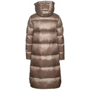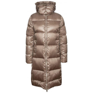 People Of Shibuya long quilted down jacket in ultralight technical fabric with ‘pearl finish’ treatment. 90/10 goose down filling. Central double-slider die-cast zip with gold finish and new round logo. Bellows side openings with metal-effect die-cast zips. External welt pockets with invisible magnetic button. Logo applied in 3D lycra in colour tone. Hood with double snap fastener. High-visibility reflective details. Translated with DeepL.com (free version)