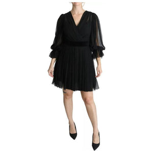 Dolce & Gabbana Black Mesh Pleated Mini Silk Blend Dress