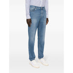 indigo blue stretch-cotton washed denim whiskering effect at the thighs embroidered logo to the front logo patch to the rear contrast stitching slim cut mid-rise button fly fastening belt loops classic five pockets Denim cotton jeans
