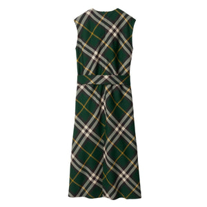 ivy green wool nova check pattern V-neck/round neck press-stud placket belted waist concealed rear hook and zip fastening sleeveless front slit rear slit mid-length silver-tone hardware Check motif wool midi dress Size and Fit - This piece fits true to size. We recommend you get your regular size. Model is 1,75m / 5ft 8in wearing size 8 (UK)