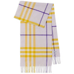 checked fringed-edge cashmere scarf from BURBERRY featuring sunflower yellow, lilac purple, cashmere, check pattern, logo patch to the front, rectangle shape, wraparound style and fringed edge. Giant Check cashmere scarf Size and Fit - Length: 168.0 Centimetres. WIDTH: 30.0 Centimetres.