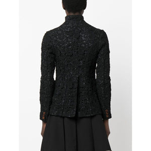 floral-embroidered button-up jacket from COMME DES GARÇONS COMME DES GARÇONS featuring jet black, all-over floral embroidery, high neck, front button fastening, long sleeves and straight hem. Single-breasted jacket Size and Fit - This piece fits true to size. We recommend you get your regular size. Model is 1,75m / 5ft 8in wearing size S