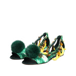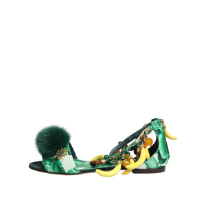Gorgeous brand new, 100% Authentic Dolce & Gabbana embellished heels sandals shoes features luxurious green satin with the brand’s signature banana leaf print, trimmed in soft mink fur for a bold and exotic touch. The open-toe design is elevated with crystal embellishments and a delicate ankle strap that adds both elegance and support. A true display of Italian craftsmanship and tropical-inspired glamour.
