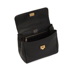 black gold-tone hardware detachable shoulder strap lock and key detail top handle logo plaque Sicily soft leather handbag