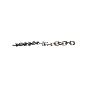 Gorgeous brand new, 100% Authentic Dolce & Gabbana silver-tone chain bracelet. Featuring an intricate mix of polished metal links and signature DG logo details, this statement piece is adorned with lustrous dark-hued pearls for a refined yet modern touch.