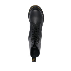 Pascal Virginia lace-up boots from DR. MARTENS featuring contrast stitching, logo pull-tab at the heel, front lace-up fastening, round toe, flat rubber sole, black and calf leather. 1460 Pascal boots Size and Fit - Heel 1,4 in / 3,5 cm; Platform 0,8 in / 2 cm