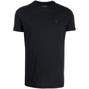 Navy-blue cotton logo-patch short-sleeved T-shirt from EMPORIO ARMANI featuring round neck, short sleeves, logo patch to the front and straight hem. Logo cotton t-shirt Size and Fit - This piece fits true to size. We recommend you get your regular size. Model is 1,84m / 6ft 1in wearing size M