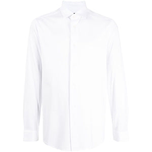 white lyocell-cotton blend spread collar front button placket buttoned-cuff sleeves curved hem Cotton blend shirt