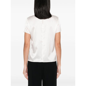 White stretch-silk round-neck stretch silk T-shirt from EMPORIO ARMANI featuring round neck, short sleeves, adjustable fit and straight hem. Silk top Size and Fit - This piece fits true to size. We recommend you get your regular size. Model is 1,75m / 5ft 8in wearing size 40 (IT)
