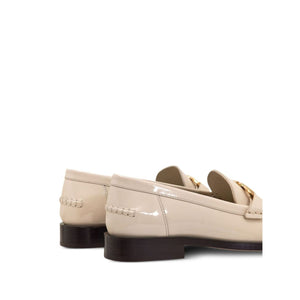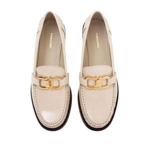 light beige leather Gancini plaque slip-on style round toe branded insole flat sole gold-tone hardware Patent leather loafers Size and Fit - Heel 0,8 in / 2 cm