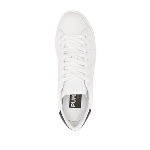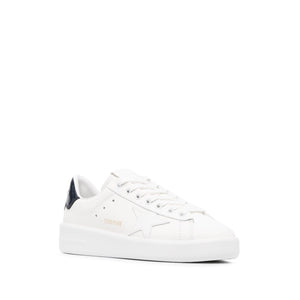 Super-Star leather sneakers from Golden Goose featuring white, navy blue, calf leather, signature star patch to the sides, round toe, front lace-up fastening, contrasting heel counter, branded insole and flat rubber sole. Purestar leather sneakers Size and Fit - Heel 1,4 in / 3,5 cm; Platform 1 in / 2,5 cm