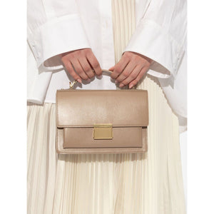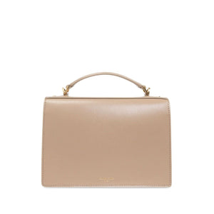 beige calf leather square body single flat top handle adjustable detachable shoulder strap main compartment embossed internal logo internal slip pocket full lining gold-tone hardware front clasp fastening gold-tone logo lettering This piece comes complete with a protective dust bag. Venezia leather handbag Size and Fit - Width 8,46 in / 21,5 cm Height 5,91 in / 15 cm Depth 3,15 in / 8 cm.