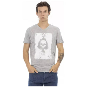 Indulge in the contemporary charm of Trussardi Action with this sleek, Gray V-neck T-shirt. Luxuriously crafted with a blend of cotton and viscose, this piece proclaims your style with its bold front print – a true testament to sartorial sophistication. Perfect for the modern trendsetter seeking to make a strong fashion statement.