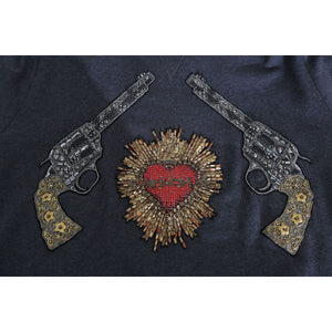Absolutely stunning, 100% Authentic, brand new with tags Dolce & Gabbana gray cotton red Crystal Heart embroidered Gun pullover sweater.