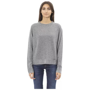 Elevate your wardrobe with the exquisite craftsmanship of Baldinini Trend. This sophisticated gray sweater features long sleeves, a comfortable crew neck, and the iconic metal monogram detail that sets it apart. Crafted from a sumptuous blend of wool, viscose, cashmere, and nylon, it ensures both warmth and luxury. The ribbed accents on the neck, wrists, and bottom hem add a touch of classic elegance, making it an essential piece for any fashion-forward individual.