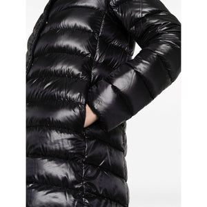 black shell down-feather filling padded design quilted logo plaque stand-up collar concealed front press-stud fastening long sleeves two side zip-fastening pockets high-low hem full lining Ameli midi down jacket Size and Fit - SLEEVE LENGTH: 85.0 Centimetres. LENGTH: 84.0 Centimetres. WAIST: 108.0 Centimetres. BUST: 102.0 Centimetres.