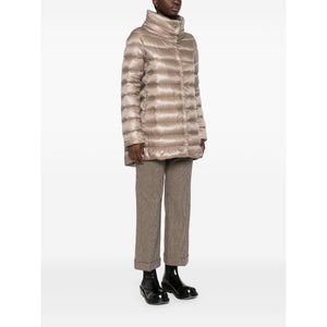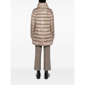 light brown padded design goose down-feather filling funnel neck long sleeves two side zip-fastening pockets logo plaque at the back authenticity QR code thigh-length high-low hem concealed front press-stud fastening Ameli midi down jacket