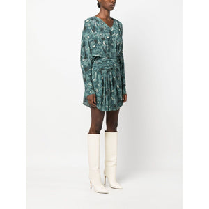 Fontana printed short dress from IRO featuring green, abstract pattern print, draped detailing, scoop neck, long sleeves, concealed side fastening and rear curved hem. Fontana printed short dress Size and Fit - This piece fits true to size. We recommend you get your regular size. Model is 1,75m / 5ft 8in wearing size 36 (FR)