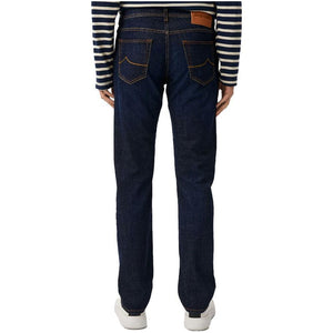 Envelope yourself in the epitome of Italian craftsmanship with these Jacob Cohen Bard slim fit jeans. Their dark blue denim is elevated by striking orange stitching details, radiating an unapologetically bold vibe. Expertly tailored for a sleek silhouette, they feature a classic five-pocket design and an ornate red decorative button that adds an unexpected twist of style. Let the bronze ponyskin logo patch be a mark of unparalleled luxury and your commitment to exquisite fashion.