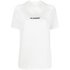 logo-print cotton T-shirt from JIL SANDER featuring white/black, cotton, logo print at the chest, crew neck, short sleeves and straight hem. Logo cotton t-shirt Size and Fit - This piece fits true to size. We recommend you get your regular size. Model is 1,75m / 5ft 8in wearing size S