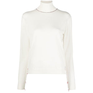 cloud white wool ribbed detailing contrast stitching roll neck long sleeves straight hem Turtleneck wool sweater Size and Fit - This piece fits true to size. We recommend you get your regular size. Model is 1,75m / 5ft 8in wearing size S
