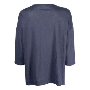 V-neck three-quarter sleeved top from MAJESTIC FILATURES featuring blue, linen blend, stretch-design, V-neck, three-quarter length sleeves and straight hem. This item contains at least 50% materials which are certified or widely recognised as having a lower environmental impact through production and/or manufacturing processes that reduce water consumption and the use of harmful chemicals, or re-use by-products of the production process.. V-neck linen blend sweater Size and Fit - This piece fits true to size. We recommend you get your regular size. Model is 1,75m / 5ft 8in wearing size 1 (NUM)