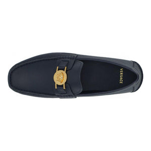 Step into luxury with these immaculate Versace loafers, a perfect blend of elegance and comfort. Crafted from the finest 100% calf leather, these navy blue loafers are brand new, complete with box, tags, and a protective dust bag. The gold-tone metal hardware showcases Versace’s iconic Medusa and logo, adding a touch of opulence to your ensemble.