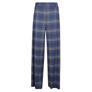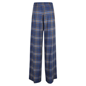 Blue trousers, paint motif, wide leg, elasticized life, two side pockets, side closure with zip. Wide leg checked trousers Size and Fit - This piece fits true to size. We recommend you get your regular size. Model is 1,75m / 5ft 8in wearing size S