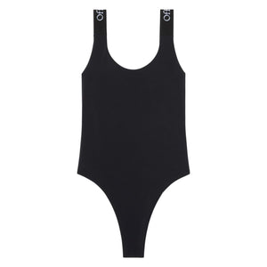 black low back wide shoulder straps scoop neck Be mindful to try on swimwear over your own garments. Logo swimsuit Size and Fit - This piece fits true to size. We recommend you get your regular size. Model is 1,75m / 5ft 8in wearing size 40 (IT)
