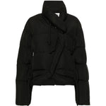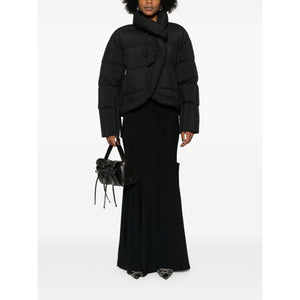black recycled polyester blend down-feather filling padded design quilted stand-up collar drawstring neck long sleeves two side zip-fastening pockets drawstring hem internal slip pocket full lining front press-stud and zip fastening This item is made from at least 50% recycled or upcycled materials. For recycled synthetic clothing products, we highly recommend using a microfibre-catching washing bag to ensure that no microplastics that can pollute water are released in the process. Learn more about what makes a product Conscious on our Conscious Criteria page Asymmetric short down jacket Size and Fit - This piece fits true to size. We recommend you get your regular size. Model is 1,75m / 5ft 8in wearing size S