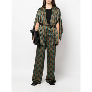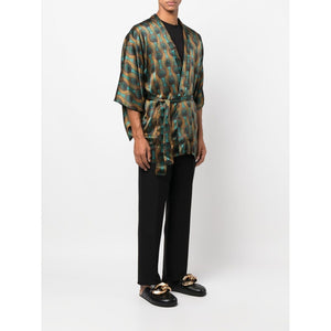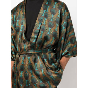 short geometric-print tie-waist jacket from OZWALD BOATENG featuring orange, multicolour, silk, geometric-pattern print, open front, short sleeves, self-tie fastening and belted waist. Printed silk short kimono Size and Fit - This piece fits true to size. We recommend you get your regular size. Model is 1,84m / 6ft 1in wearing size M