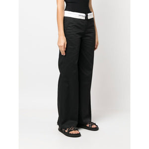 reversed waistband trousers from PALM ANGELS featuring black/white, cotton blend, logo waistband and straight leg. Flare-leg trousers Size and Fit - This piece fits true to size. We recommend you get your regular size. Model is 1,75m / 5ft 8in wearing size S