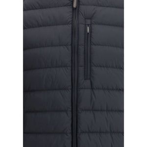 Parajumpers’ Last Minute hooded Down Jacket, treated with a water-repellent finish, is designed for comfort and protection. Featuring an adjustable hood with drawstring and front closure with a double-slider zipper, it offers three exterior zippered pockets and an interior pocket with Velcro closure. It features underarm ventilation, elasticized hem and cuffs and elastic rib inner collar. Completing the design is the Parajumpers patch on the sleeve and the iconic yellow tape at the collar closure.