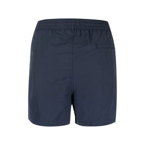 navy blue recycled polyamide side stripe detailing drawstring waist rear welt pocket straight leg Be mindful to try on swimwear over your own garments. Signature Stripe swim shorts Size and Fit - This piece fits true to size. We recommend you get your regular size. Model is 1,84m / 6ft 1in wearing size M