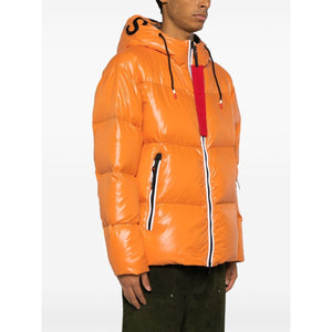 carrot orange feather down padded design high-shine finish logo print at the hood slouchy drawstring hood front two-way zip fastening long sleeves two side zip-fastening pockets internal mesh pockets drawstring hem full lining Core nylon down jacket Size and Fit - This piece fits true to size. We recommend you get your regular size. Model is 1,84m / 6ft 1in wearing size M