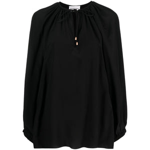 self-tie silk blouse from phaeonia featuring black, silk, self-tie fastening, keyhole neck, long raglan sleeves and elasticated cuffs. Anita long sleeves blouse Size and Fit - This piece fits true to size. We recommend you get your regular size. Model is 1,75m / 5ft 8in wearing size 40 (IT)