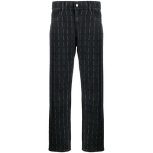 logo-printstraight-leg jeans from Pleasures featuring black, cotton, all-over logo print, mini logo tag, logo patch to the rear, belt loops, concealed fly and button fastening, classic five pockets and straight leg. Impact denim jeans Size and Fit - This piece fits true to size. We recommend you get your regular size. Model is 1,84m / 6ft 1in wearing size 32 (WAIST CM)