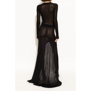 black wool semi-sheer construction asymmetric design scoop neck long sleeves asymmetric hem long length Wool long dress Size and Fit - This piece fits true to size. We recommend you get your regular size. Model is 1,75m / 5ft 8in wearing size S