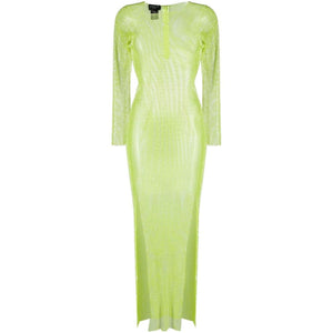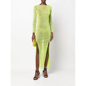 Diamonds rhinestone-embellished mesh maxi dress from SANTA BRANDS featuring lime green, cotton blend, semi-sheer construction, mesh panelling, rhinestone embellishment, round neck, long sleeves, side slits, rear zip fastening and ankle-length. Rhinestones embellished long dress Size and Fit - This piece fits true to size. We recommend you get your regular size. Model is 1,75m / 5ft 8in wearing size UNI