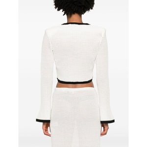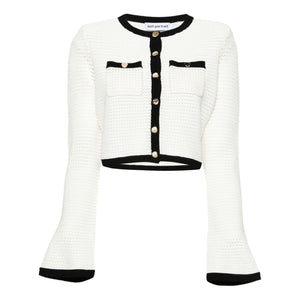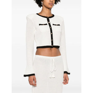 white/black pointelle knit contrasting ribbed trim round neck front button fastening long sleeves flared cuffs cropped straight hem unlined Crochet cropped cardigan Size and Fit - This piece fits true to size. We recommend you get your regular size. Model is 1,75m / 5ft 8in wearing size S