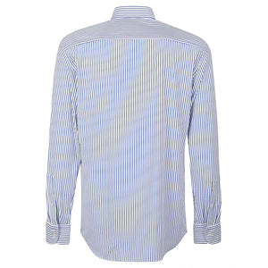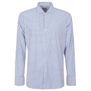 Blue shirt, striped, buttons closure, high collar. Striped shirt Size and Fit - This piece fits true to size. We recommend you get your regular size. Model is 1,84m / 6ft 1in wearing size 39 (COLLAR CM)