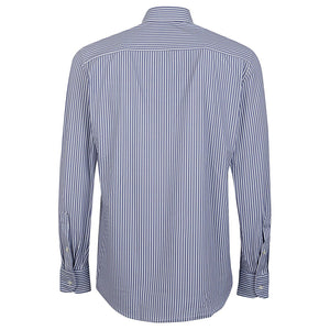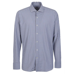 Blue shirt, striped, buttons closure. Striped shirt Size and Fit - This piece fits true to size. We recommend you get your regular size. Model is 1,84m / 6ft 1in wearing size 39 (COLLAR CM)