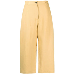 yellow linen high waist front button and zip fastening wide leg This item contains at least 50% materials which are certified or widely recognised as having a lower environmental impact through production and/or manufacturing processes that reduce water consumption and the use of harmful chemicals, or re-use by-products of the production process. Learn more about what makes a product Conscious on our Conscious Criteria page Wide leg cropped cotton trousers Size and Fit - This piece fits true to size. We recommend you get your regular size. Model is 1,75m / 5ft 8in wearing size 1 (NUM)